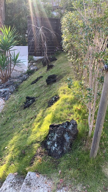 今回溶岩石が主だったのですが非常に表情豊かな石でしたのでそこを生かしつつ、芝生との一体感を出すために半分程度埋めたりしてみました。移設作業は設置に時間がかかるため、1日で終わらないことも多々あります。
