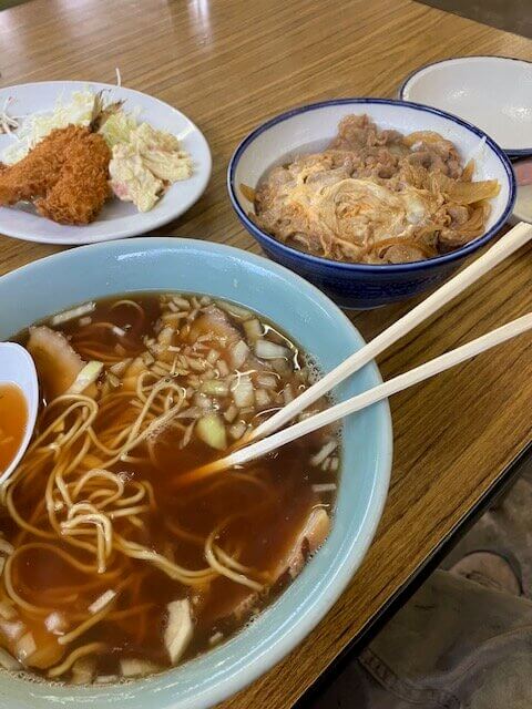 ここは生のアジを使ったアジフライが名物ですね。いつもとほぼ同じ注文でチャーシュー麺とアジフライと肉丼。チャーシュー麺は竹岡風で玉ねぎが薬味として入っていて美味しい。