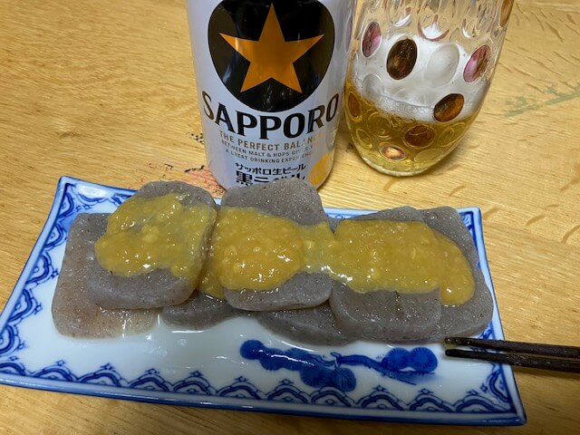 匝瑳市の造園屋さんのご主人より自家製こんにゃくをいただきました。刺身でも食えるとのことでしたが少し茹でて田楽でいただきます。奥様が作っておりましたが結構作るの大変そうです。そしてすごく美味い。