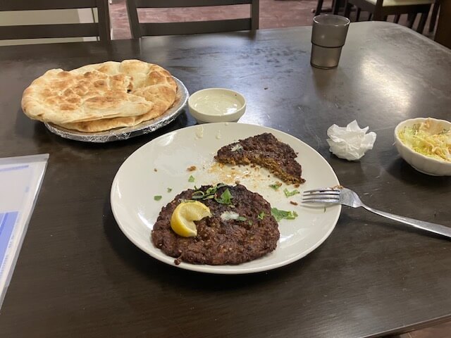 いつもマライティッカっていう辛くもないバーベキューされた鶏肉食べてますが今回は新しいのに挑戦。「チャプリカバブ」。チャプリはパシュトー語で「平らにする」って意味らしいです。パキスタンとかアフガニスタンの料理ですね。