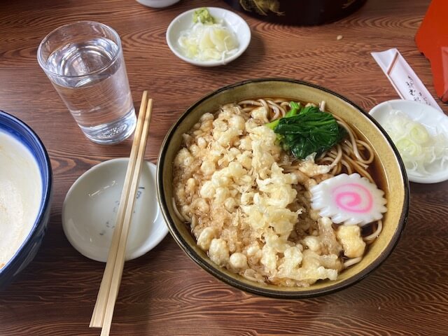 ここは丼ものが美味いのですが今まで親子丼は頼んだことないので挑戦。もも肉が大ぶりのまま入ってます。かつ丼が有名ですが親子丼もそこそこいけます。そば屋でそば頼まないのも流儀に反するのでたぬきそばも注文。食べすぎですね。