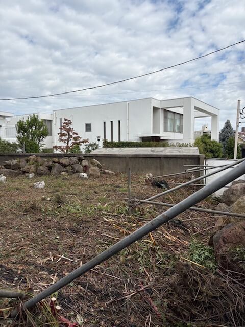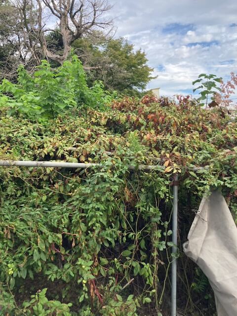 まず草刈り作業を行いました。ほぼすべての範囲に防草シートが張ってあるのですが防草シートの使用期限の3年を大幅に過ぎていて劣化してしまったため、雑草が生えたような状況です。刈払い機に防草シートが絡まってしますため、地面の少し上を刈り、除草剤と殺虫剤を散布。作業完了。蜂や蚊の駆除のための防除作業のみも行っております。