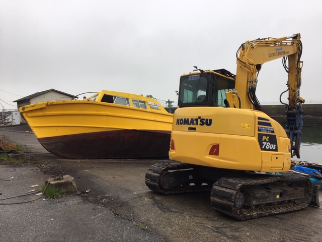 このくらいの大きさの船の解体には0.3㎥仕様のバックホーで解体するのが一番の近道。ベストな機種を今回もご用意させていただきました。